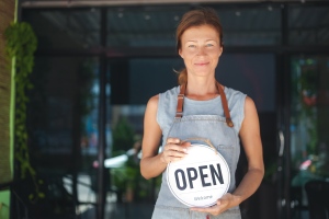 Woman waitress apron, cafe owner standing in the doorway, holdin
